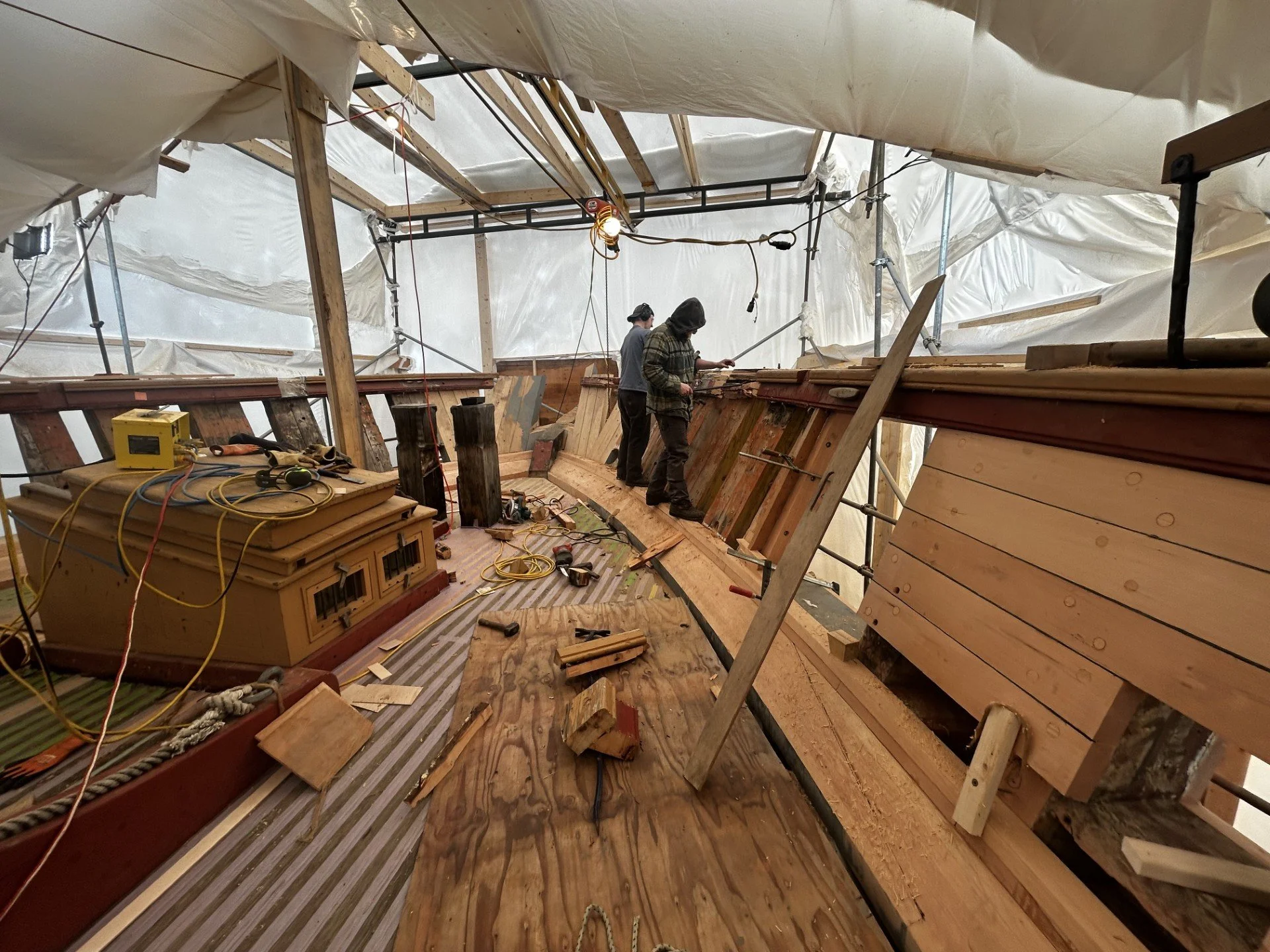 Many of the outer hull planks were removed—some due to rot and some to allow us access to inspect and repair the inner stem timber and framing.