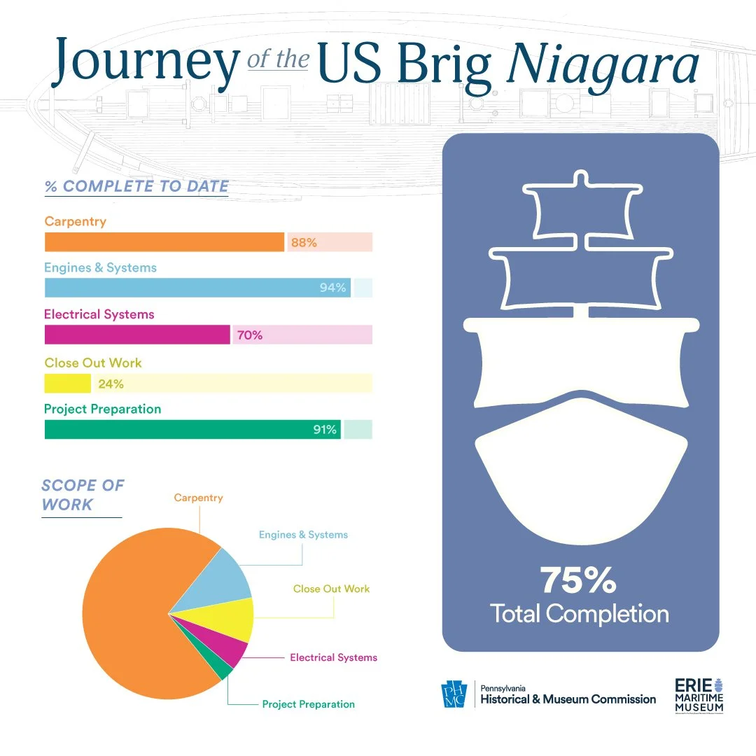 To date, the U.S. Brig Niagara capital repair and refit project is approximately 75% complete. As you can see in the infographic, we’re making excellent progress across all major categories.