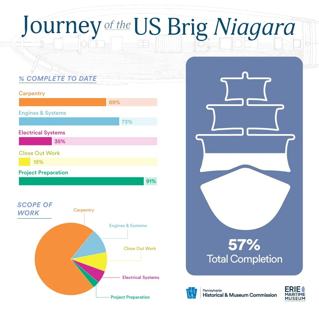 To date, the U.S. Brig Niagara capital repair and refit project is approximately 57% complete. As you can see in the infographic, we’re making excellent progress across all major categories.