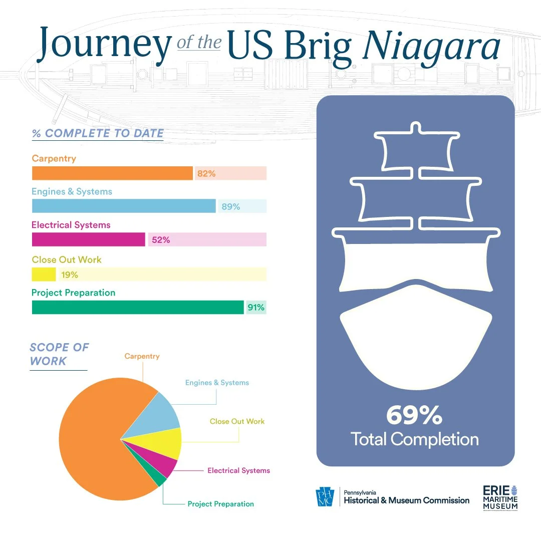 To date, the U.S. Brig Niagara capital repair and refit project is approximately 69% complete. As you can see in the infographic, we’re making excellent progress across all major categories.